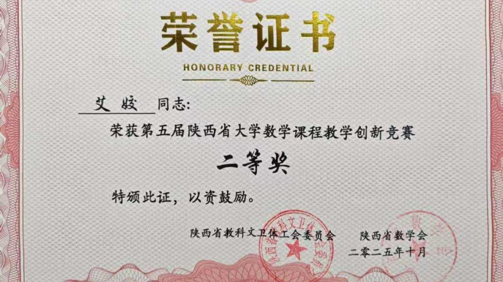 我院教师艾姣在第五届陕西省大学数学课程教学创新竞赛中荣获二等奖