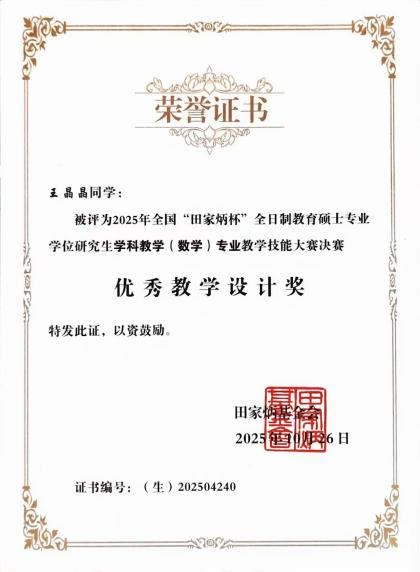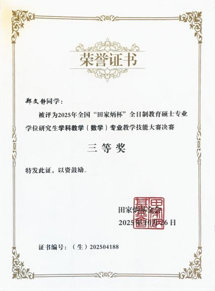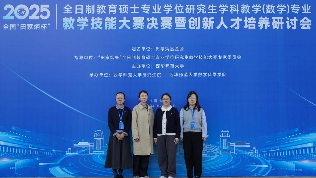10月24日至26日,2025年“田家炳杯”全日制教育硕士专业学位研究生学科教学(数学)专业教学技能大赛(决赛)于西华师范大学顺利举行,共有来自全国111所高校的274名同学参加决赛。我院2023级学科教学(数学)专业研究生郑文静(指导老师:高小燕)获三等奖,王晶晶(指导老师:马崛)获优秀教学设计奖。